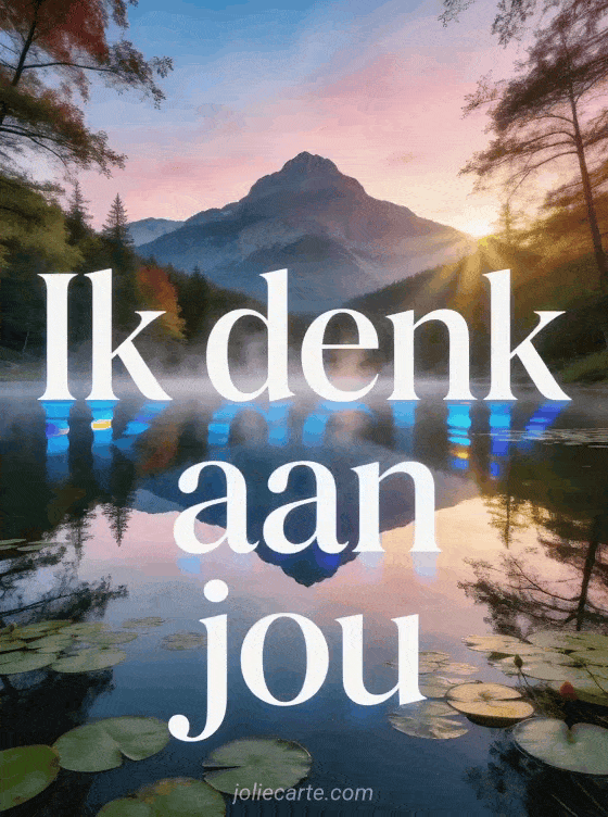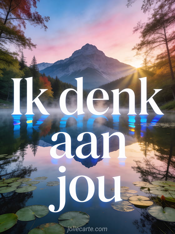 Stuur een mystieke kaart met een perfect spiegelmeer en bergweerspiegeling bij zonsopgang met lichte neveldamp boven het water en waterlelies om iemand te laten weten dat je aan hem denkt. Bekijk ook een geanimeerde gifs ik denk aan jou, geanimeerde afbeeldingen ik denk aan jou of geanimeerde gif ik denk aan jou.