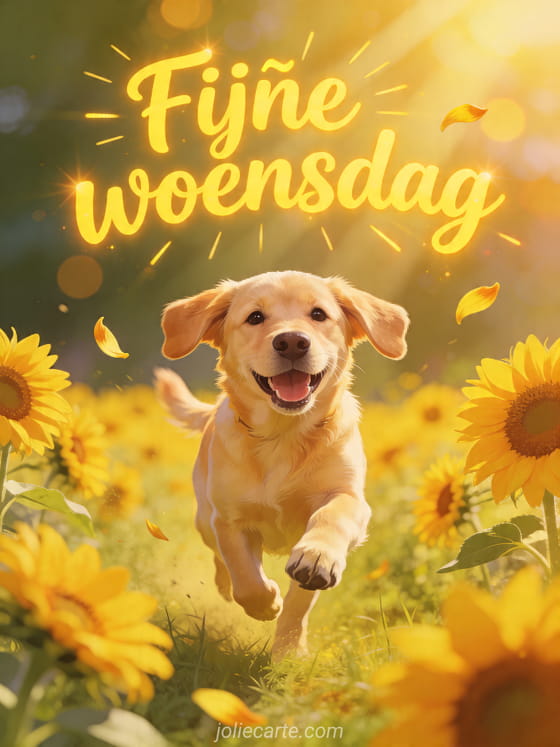Deel een stralende fijne woensdag met deze opgewekte kaart van een glimlachende labrador tussen zonnebloemen. Ontdek ook foto goedemorgen fijne woensdag, woensdag woensdag afbeelding goedemorgen en fijne dag of bericht fijne woensdag.