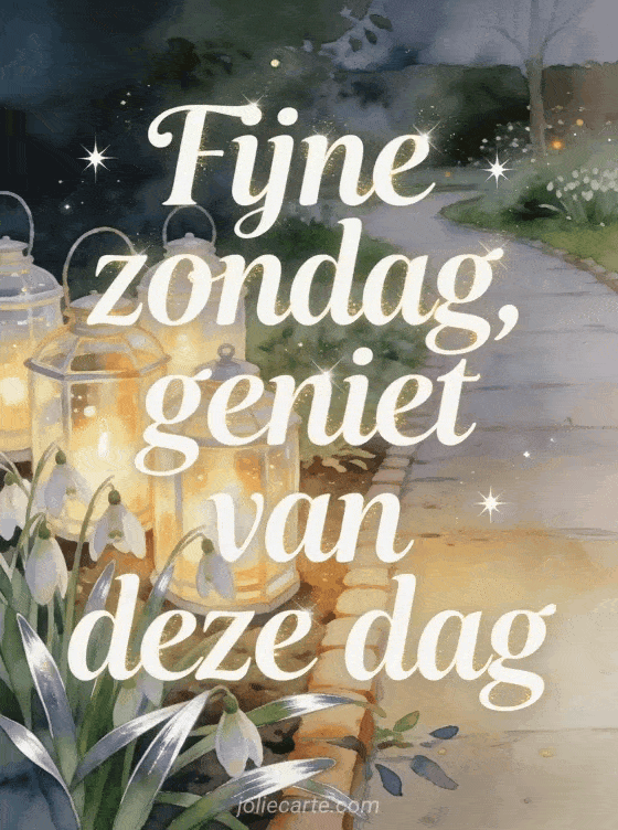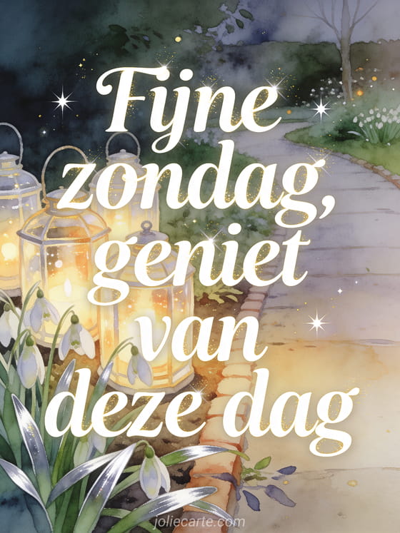 Wens fijne zondag en geniet van deze dag met gloeiende glazen lantaarns naast een tuinpad, sneeuwklokjes en zilvergroene bladeren in zacht gouden aquarellicht. Deel deze fonkelende kaart en ontdek ook fijne zondag geanimeerde kaarten, zondag kusjes afbeelding of fijne zondag kaart.