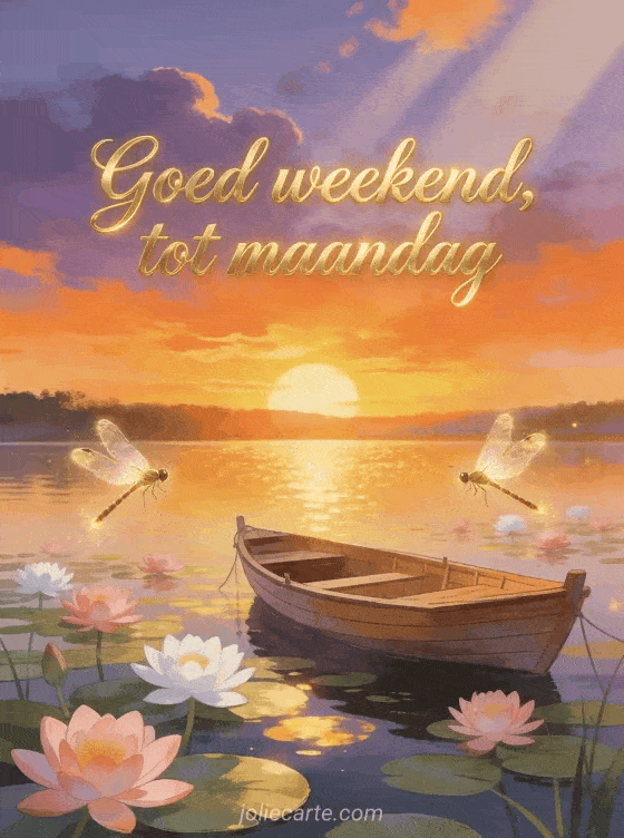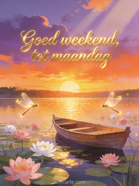Deel een mooie weekendgroet met een rustig meer, bloeiende waterlelies en een stralende zonsondergang. Bekijk ook fijne maandag in afbeeldingen, afbeelding van fijne maandag en goedemorgen fijne maandag.