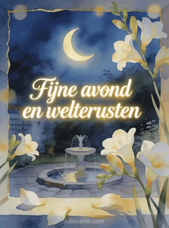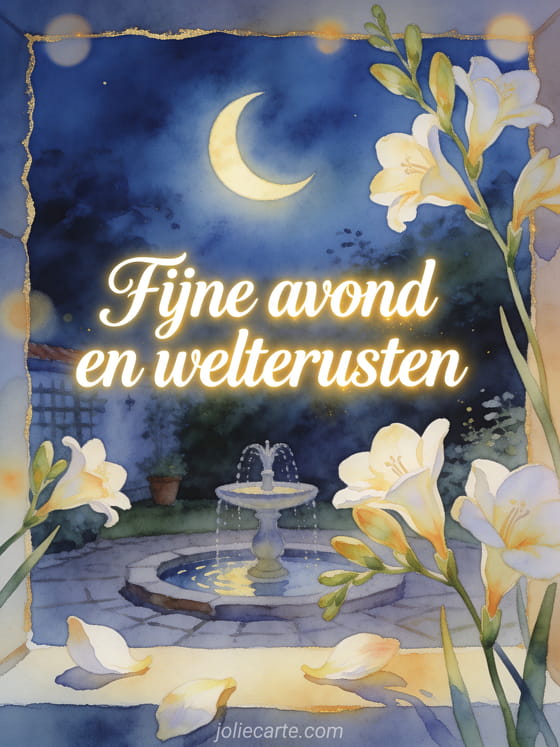 Stuur fijne avond en welterusten met een aquarelkaart met een wassende maan, een kleine fontein op de binnenplaats, fresia's en rustig avondblauw. Ontdek ook een welterusten e-card, een virtuele kaart fijne avond welterusten of een mooi welterusten bericht.