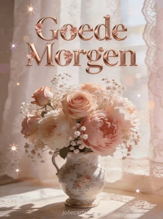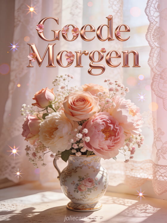 Stuur een romantische goede morgen bloemen kaart met een prachtig boeket verse rozen, pioenen en gipskruid in een vintage vaas, verlicht door zacht ochtendlicht door kanten gordijnen. Ontdek ook een goede morgen geanimeerd kaart of een goede morgen humor kaart of een een goede morgen kaart.