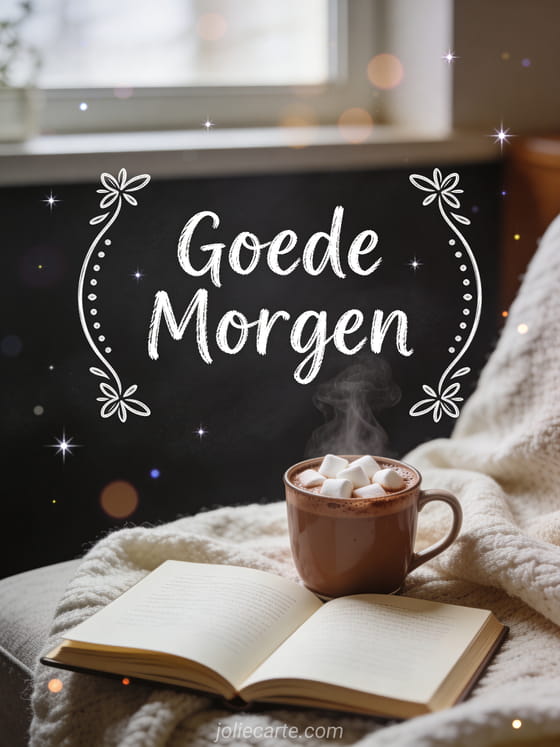 Stuur een motiverend goede morgen citaat kaart met een dampende mok warme chocolademelk met marshmallows naast een open dagboek in een gezellige leeshoek met zachte deken. Ontdek ook een goede morgen schat kaart of een ik wens jullie een goede morgen kaart of een goedemorgen kaart.