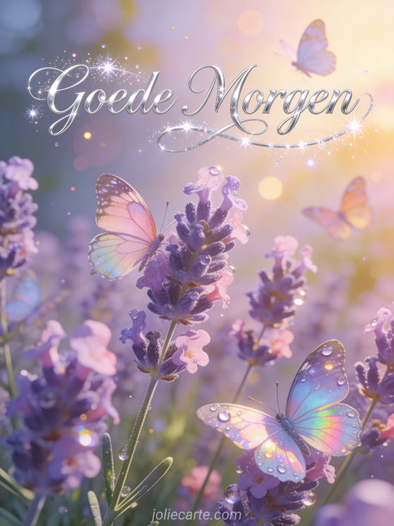 Stuur een magische geanimeerde goede morgen wens met kleurrijke vlinders dansend rond lavendelbloemen met regenboog dauwdruppels in een betoverde tuin. Ontdek ook een goede morgen humor kaart of een een goede morgen kaart.