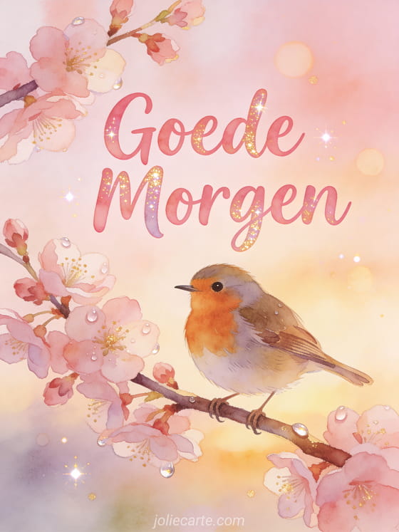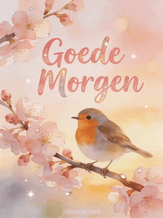 Stuur een delicate goede morgen gif met een schattig roodborstje gezeten op een bloeiende kersenboomtak met vroegochtend dauwdruppels glinsterend op de bloemblaadjes.