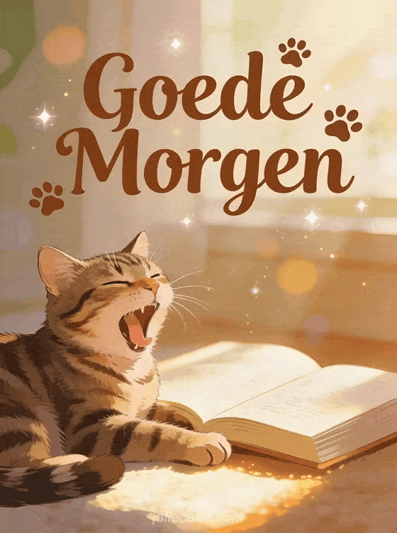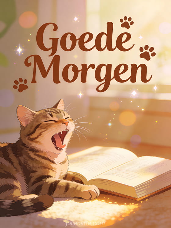Stuur een ontspannen goede morgen kat kaart met een slaperige gestreepte kat die lui gaapt op een zonnige plek naast een boek in een gezellige luie ochtendsfeer. Ontdek ook een goede morgen afbeeldingen kaart of een goede morgen voor jou kaart of een lieverd goede morgen kaart.