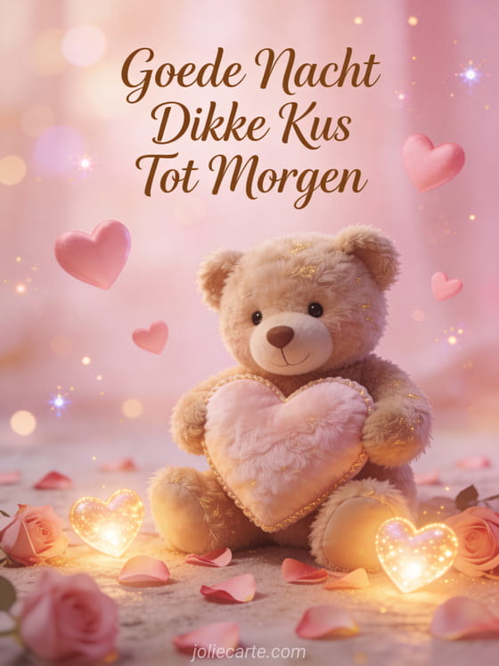 Stuur een liefdevolle goede nacht dikke kus tot morgen kaart met een schattige teddybeer die een hartkussen vasthoudt, omringd door roze rozenblaadjes en zachte gloeiende harten. Ontdek ook een goede nacht tot morgen humor kaart of een goede nacht slaap lekker tot morgen kaart of een humor goede nacht tot morgen kaart.
