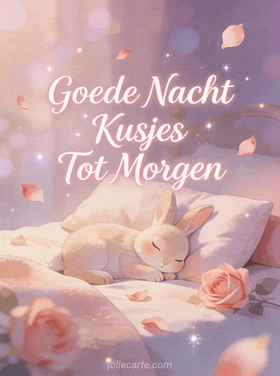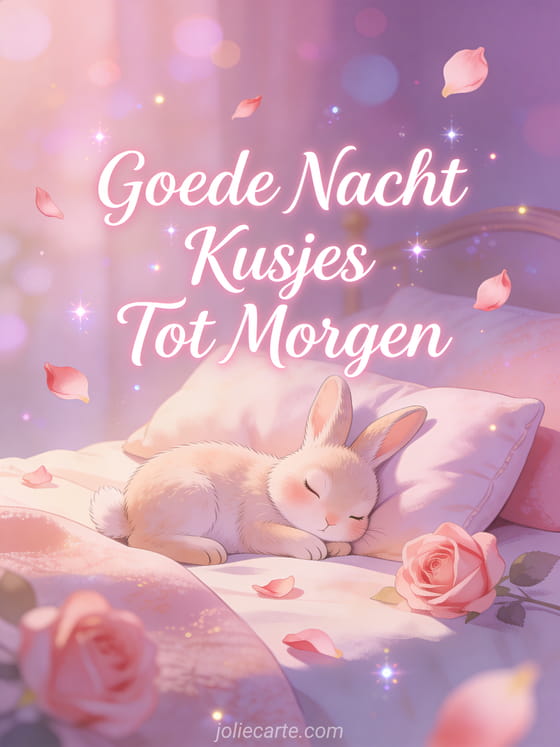 Stuur een romantische goede nacht kusjes tot morgen wens met rozenblaadjes dwarrelen zachtjes en een schattig slapend konijn op zachte kussens. Ontdek ook een fijne avond en goede nacht tot morgen kaart of een goede nacht tot morgen kaart.