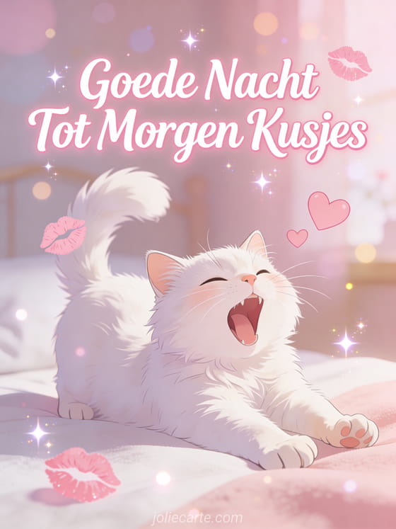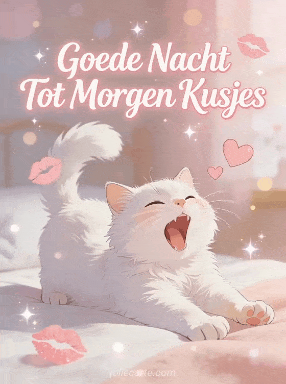 Stuur een adorable goede nacht tot morgen kusjes gif met een pluizig wit katje dat zich schattig uitrekt en gaapt, met roze kusjesafdrukken en fonkelende hartjes in een lieve geanimeerde sfeer. Ontdek ook een fijne avond goede nacht tot morgen kaart of een geanimeerde gifs goede nacht tot morgen kaart of een gif goede nacht kusjes tot morgen kaart.