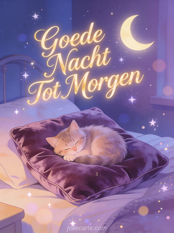 Stuur een dromerige goede nacht tot morgen wens met een vredig slapend kitten op een fluwelen kussen omringd door twinkelen sterren en een sikkel maan.