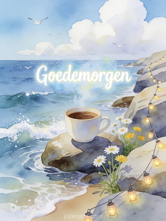 Stuur een frisse goedemorgen afbeelding met koffie voor een perfect begin van de dag aan de zee. Ontdek ook een geanimeerde gif goedemorgen koffie croissant, een hart gif goedemorgen koffie of een glimlach fijne dag koffie.