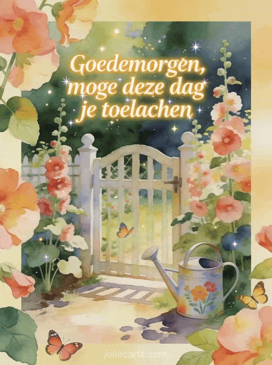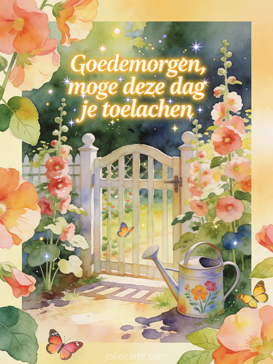 Stuur een vrolijke goedemorgenkaart met zonnig okergele aquarelletters, een charmante tuinpoort tussen stokrozen, een beschilderde gieter en heldere vlinders. Ontdek ook een goedemorgen bericht voor mijn vrouw, een mooi goedemorgen bericht of een schattig goedemorgen bericht met tederheid in de ochtend.
