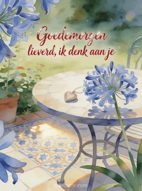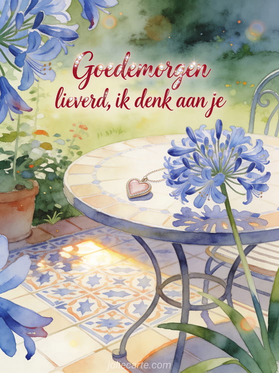 Stuur een romantische goedemorgenkaart met tedere karmozijnrode aquarelletters, een gezellige tuintafel, blauwe agapanthusbloemen, een klein hartvormig medaillon en tegels met patroon. Ontdek ook een virtuele goedemorgen kaart, een goedemorgen bericht voor mijn man of een goedemorgen bericht aan een vriend.
