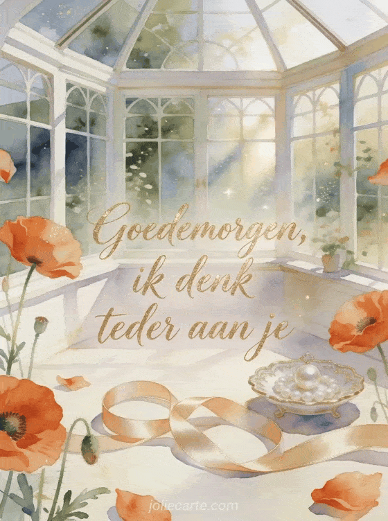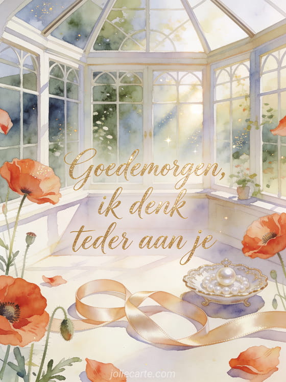 Stuur een poëtisch goedemorgen bericht voor haar met delicate roze aquarelletters, klaprozen, een parelmoeren sieradenschaaltje en lussen van satijnen lint in een heldere veranda. Ontdek ook goedemorgen bericht voor een vriendin, bloemrijke goedemorgen kaart of mooie gratis virtuele goedemorgen kaart.