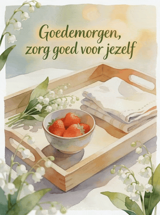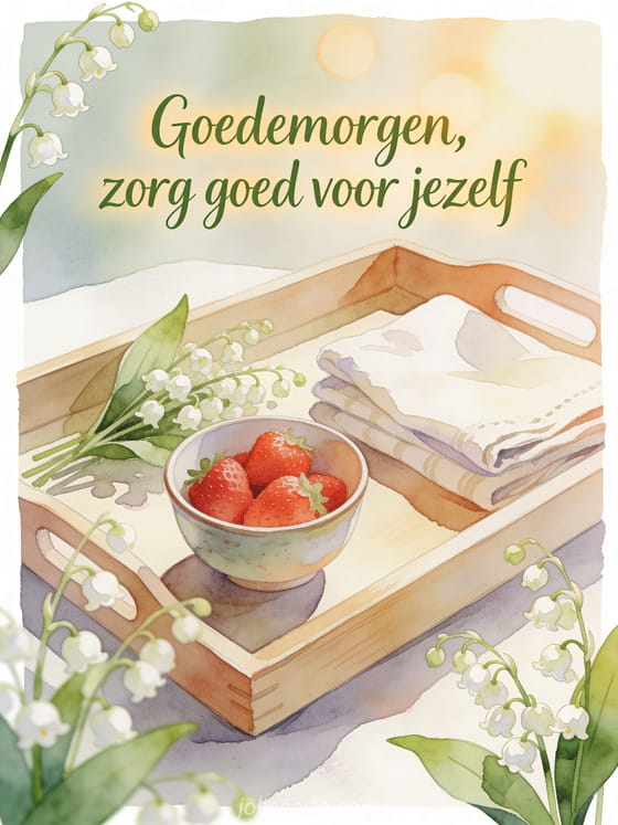 Stuur een goedemorgen bericht voor hem met een kalmerend aquarelontbijtblad, lelietjes-van-dalen, aardbeien en gevouwen linnen. Deze tedere kaart zegt zorg goed voor jezelf met zachte ochtendwarmte, en je kunt ook hallo gaat het goed, een goedemorgen bericht aan je geliefde of goedemorgen aan je geliefde ontdekken.