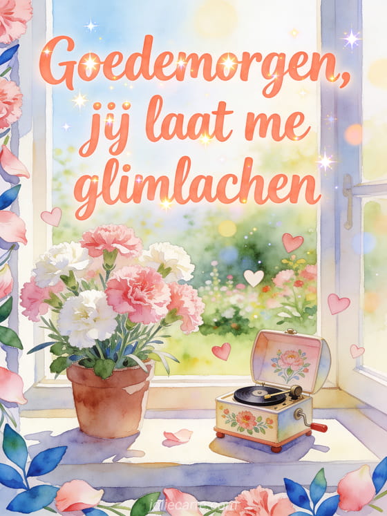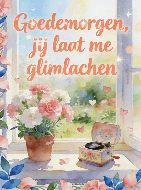 Stuur een vrolijk goedemorgen bericht voor je crush met koraalkleurige aquarelletters, anjers, een klein muziekdoosje en hartvormige confetti. Ontdek ook goedemorgen bericht voor mijn mooie, goedemorgen geanimeerde gif of goedemorgen zonnig.