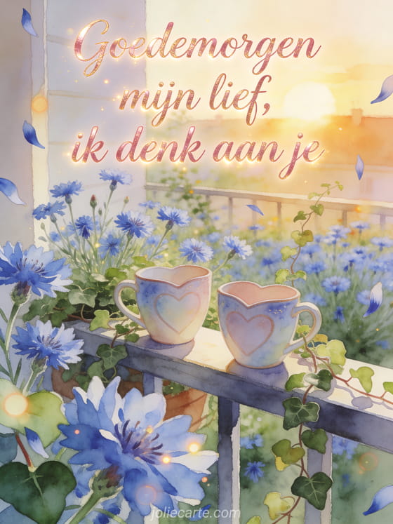 Stuur een tedere goedemorgenkaart met rosegouden aquarelletters, een balkontuin bij zonsopgang, korenbloemen, klimop en twee hartvormige keramische mokken. Ontdek ook een goedemorgen bericht aan een vriend, een goedemorgen bericht voor de ochtend of geanimeerde goedemorgen kaarten.