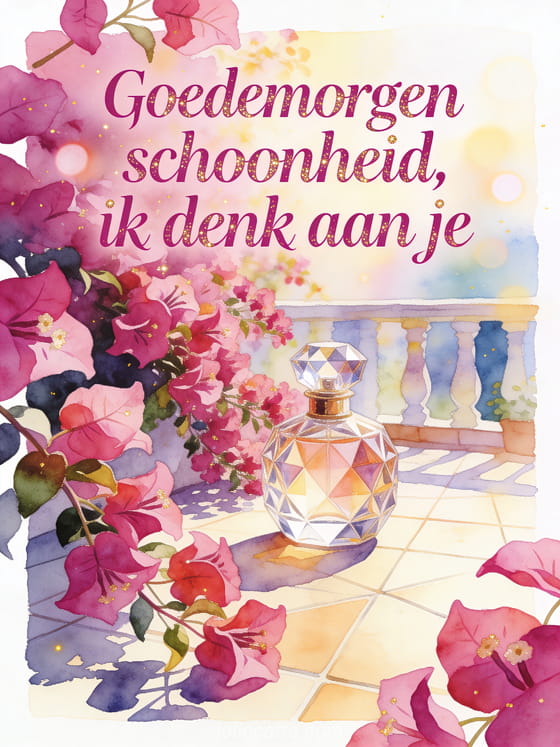 Stuur een romantisch goedemorgen bericht voor mijn mooie met elegante aquarelletters, een parfumflesje en heldere bougainville. Ontdek ook ontroerend goedemorgen bericht, goedemorgen humor afbeelding of humor van de dag goedemorgen.