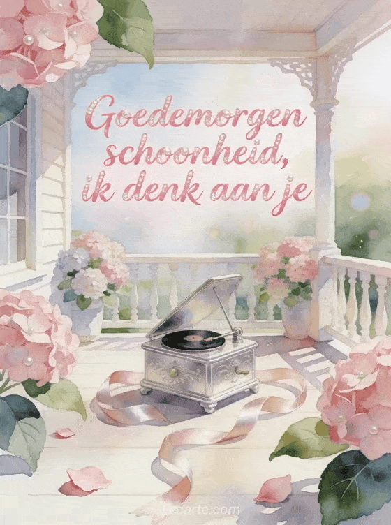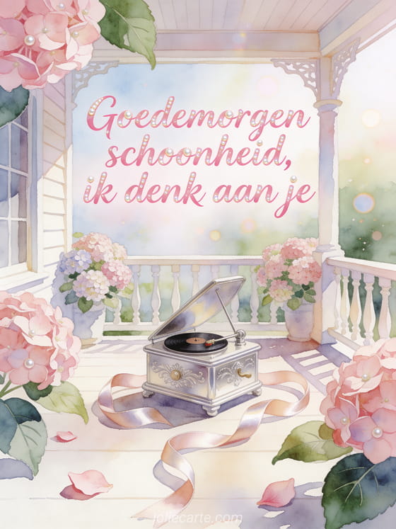 Stuur een romantische kaart met een lichte veranda, hortensiatrossen, een zilveren muziekdoos en satijnen linten in zacht ochtendlicht. Ontdek ook een ontroerend goedemorgen bericht, een ochtend goedemorgen bericht of een geanimeerde virtuele goedemorgen kaart.