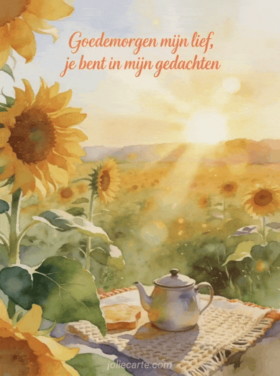 Stuur een goedemorgen bericht voor zijn vrouw met een stralende kaart vol ochtendwarmte, zonnebloemen en liefdevolle tederheid. Deel ook moerasbloemen, een kat die goedemorgen zegt of een ochtend goedemorgen.