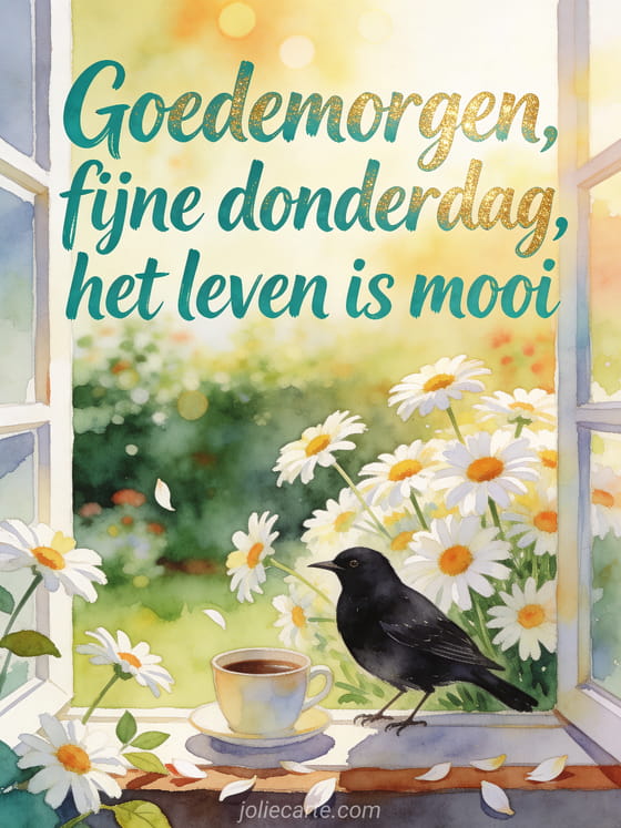 Deel een vrolijke donderdagboodschap met smaragdgroene letters, gouden glans, een merel bij een kop koffie, heldere margrieten en een open tuinraam vol warm ochtendlicht. Stuur ook een fijne donderdag geanimeerde afbeelding, goedemorgen fijne donderdag kusjes afbeeldingen of een goedemorgen fijne donderdag citaat.