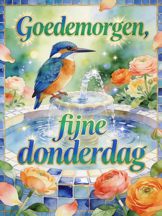 Stuur een vrolijke goedemorgen en fijne donderdag groet met een ijsvogel bij een kleine fontein, ranonkelbloemen en geglazuurde tegels in sprankelend tuinlicht. Ontdek ook gratis virtuele fijne donderdag kaarten, een fijne donderdag plaatje of fijne winterse donderdag.