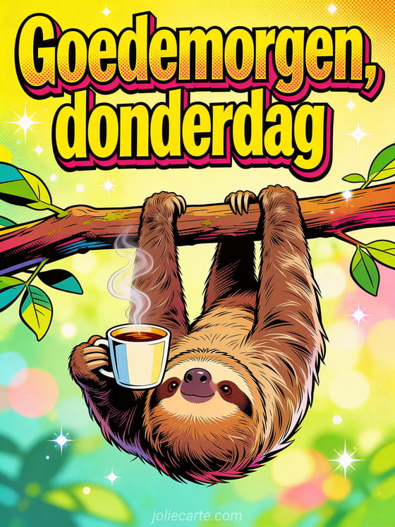 Deel goedemorgen donderdag humor met een grappige luiaard die ondersteboven aan een tak hangt met een kop koffie in zijn hand. Blijf glimlachen met fijne donderdag in de regen afbeelding, fijne donderdag afbeeldingen gifs of positieve gedachte positieve fijne donderdag citaat.