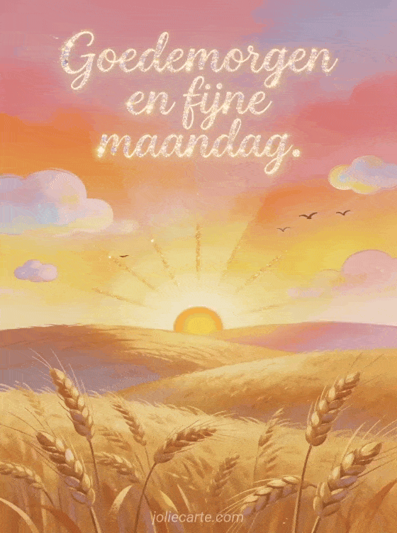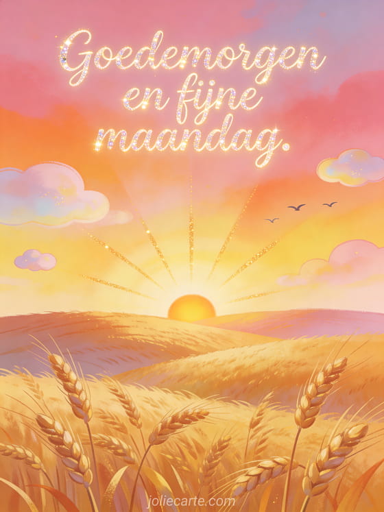 Stuur goedemorgen en fijne maandag met een zonsopgang achter golvende tarwevelden, een levendige lucht en zachte lichtstralen. Bekijk ook gratis fijne maandag kaarten, fijne maandag en fijne week afbeelding of fijne maandag kusjes gif.