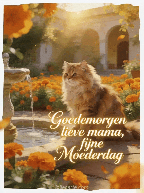 Deel een stralende ochtendkaart voor Moederdag met een Perzische kat, gouden afrikaantjes, een kleine fontein en heldere zonsopgangsdetails. Ontdek ook versjes voor Moederdag, een Moederdagvers of een fijne Moederdag bericht.