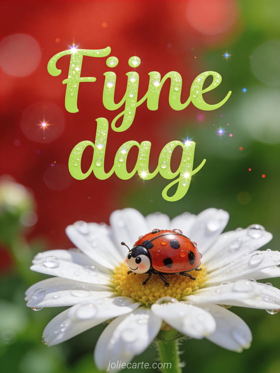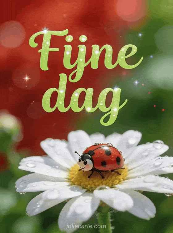 Stuur een frisse fijne dag groet met een vrolijk lieveheersbeestje op een witte margriet, ochtenddauw en levendige rode en groene kleuren. Ontdek ook een geanimeerde fijne woensdag afbeelding, hoi fijne woensdag humor of goedemorgen het is woensdag gif.