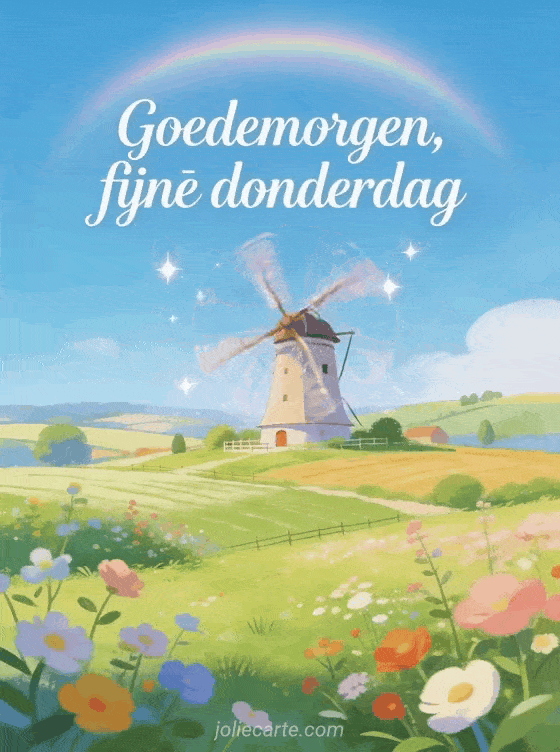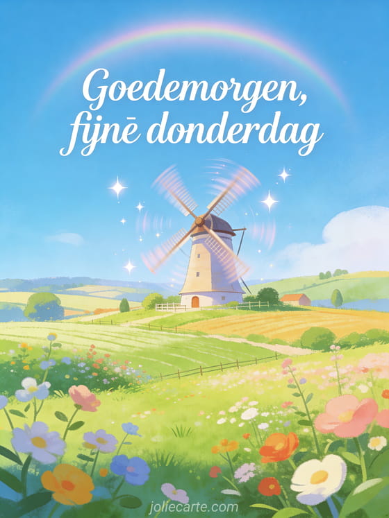 Deel goedemorgen, fijne donderdag met elegante kalligrafie, zachte halo, kleurrijk platteland, een draaiende molen onder een heldere blauwe lucht, fijne schittering en frisse sfeer. Bekijk ook goedemorgen fijne donderdag kusjes afbeeldingen, fijne donderdag glimlach of geanimeerde fijne donderdag kaart.