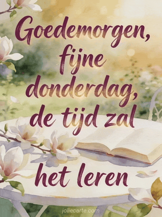Deel goedemorgen, fijne donderdag, de tijd zal het leren met pruimkleurige letters, een open boek en bloeiende magnoliatakken op een lichte tuintafel. Ontdek ook tekst om een fijne donderdag te wensen, fijne donderdag kusjes gifs of fijne donderdag geanimeerde gif.