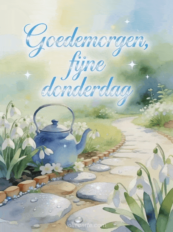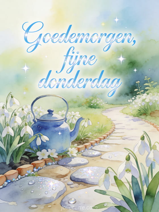 Deel een frisse kaart voor goedemorgen en fijne donderdag met sneeuwklokjes, een blauw geëmailleerde ketel, dauwfrisse stenen en een helder tuinpad. Bekijk ook fijne donderdag gifs, goedemorgen en fijne donderdag afbeelding of fijne donderdag koffie gif.