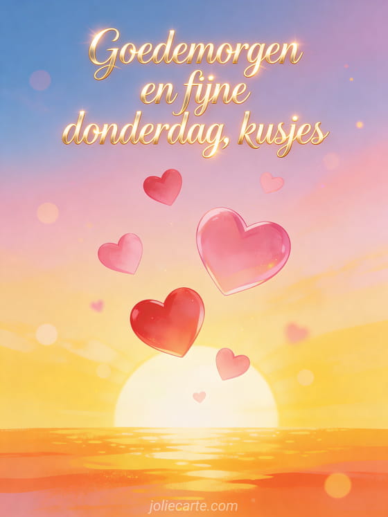 Deel goedemorgen en fijne donderdag, kusjes met elegante letters, warme glans, zwevende harten boven een zonnige horizon, zijdeachtige verlopen, subtiele bokeh en vrolijke sfeer. Bekijk ook fijne donderdag glimlach, geanimeerde fijne donderdag kaart of fijne donderdag kusjes.
