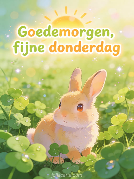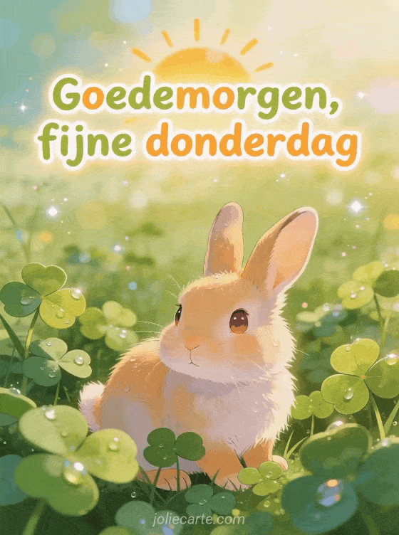 Stuur een schattige goedemorgen fijne donderdag groet met een konijn in een weide van klavers, ochtenddauw en frisse lentegloed. Ontdek ook mooie geanimeerde afbeeldingen fijne donderdag, geanimeerde fijne donderdag afbeelding of fijne zonnige donderdag afbeeldingen.