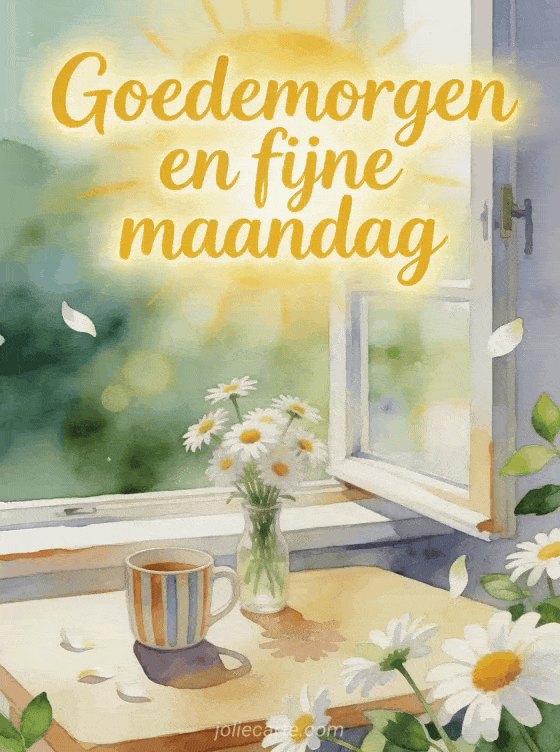 Begin de week met een goedemorgen en fijne maandag in zonnig gele letters. Deze gratis kaart toont een ontbijttafel, een gestreept kopje, margrieten en een open raam voor een frisse en opbeurende sfeer. Bekijk ook een goedemorgen fijne maandag geanimeerde gif kaart, een fijne maandag vrouw gif kaart of een goedemorgen fijne maandag afbeelding kaart.