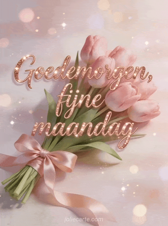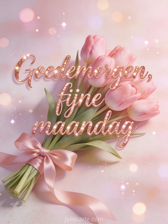 Stuur een tedere goedemorgen fijne maandag groet met een roze tulpenboeket met satijnen lint, roségouden glans en zachte sprankelende bokeh. Ontdek ook goedemorgen maandag afbeelding, fijne week en fijne maandag afbeelding of fijne maandag kaart.