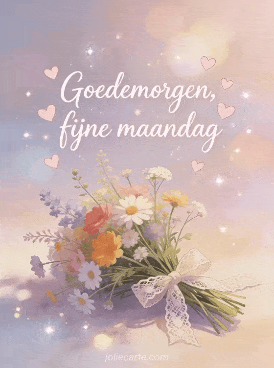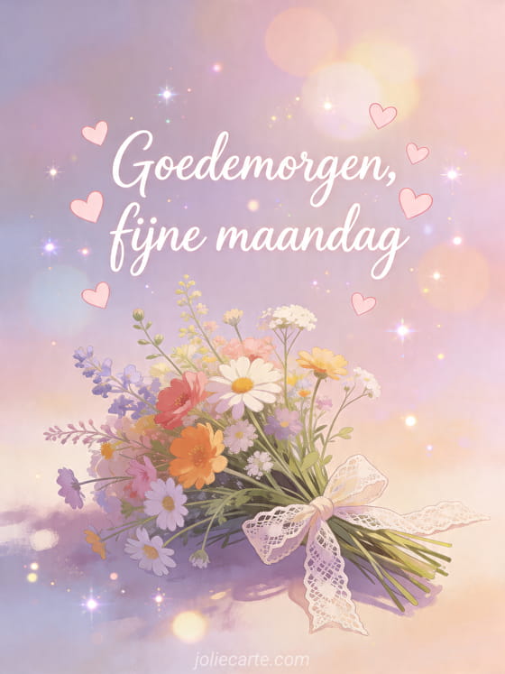 Stuur een lieve Goedemorgen kaart met een boeket wilde bloemen en kanten lint voor een liefdevolle start van de week. Bekijk ook goedemorgen maandag goed begin van de week, grappig fijne maandag en fijne maandagochtend.