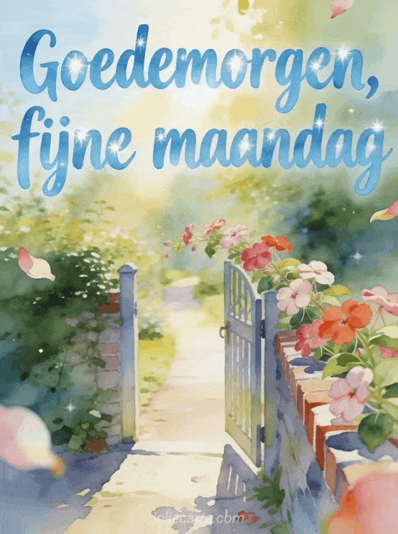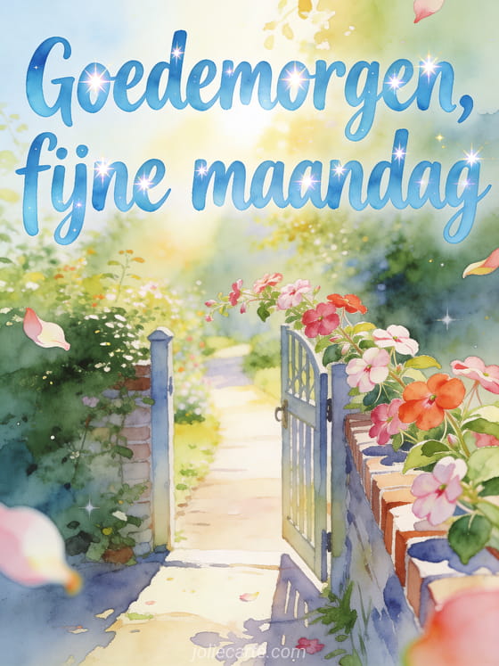Verwelkom de week met een heldere aquarel van een tuinpoort die opent naar een zonnig pad, omringd door impatiensbloemen en stralende kleuren. Je kunt ook mooie afbeeldingen om een fijne maandag te wensen, fijne maandag bloemen gif of fijne maandag glitterende afbeelding delen.
