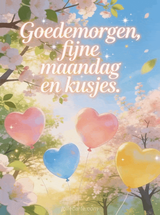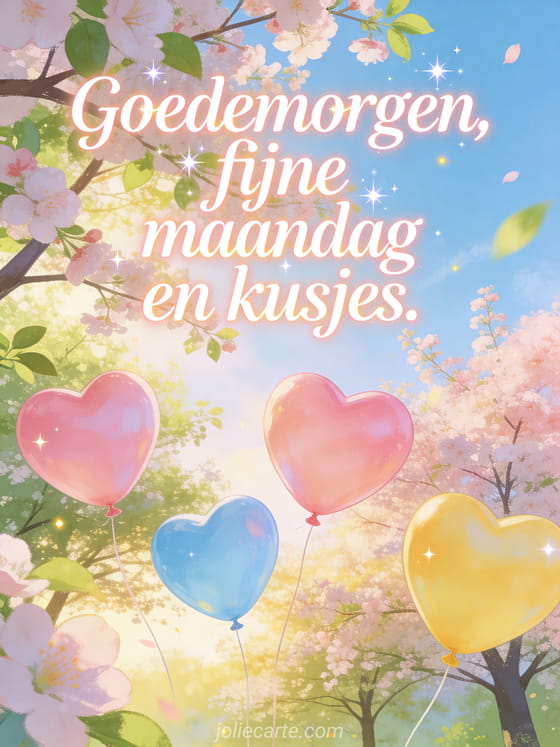 Stuur goedemorgen, fijne maandag en kusjes met hartvormige ballonnen boven lentebomen. Bekijk ook fijne zonnige maandag gif, maandag kusjes afbeeldingen of grappige fijne maandag humor.