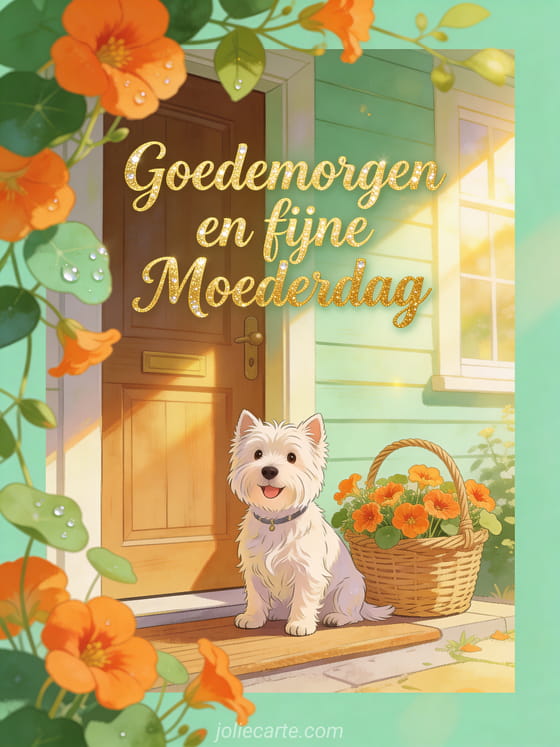 Begin haar bijzondere dag met een hartelijke goedemorgen fijne moederdag wens. Deze vrolijke geïllustreerde kaart toont een westie hond op de drempel met felgekleurde capucines. Ontdek ook een gratis moederdagkaart of een gratis virtuele moederdagkaart.