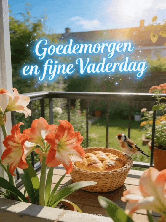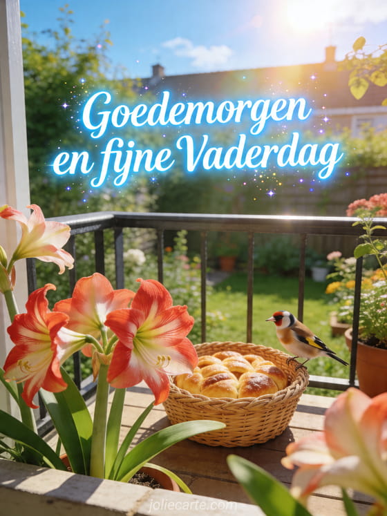 Stuur een stralende goedemorgen en fijne Vaderdag groet met een balkontuin vol amaryllis, ochtendlicht en een vink. Ontdek ook een overhemd Vaderdagkaart of een Vaderdagkaart.