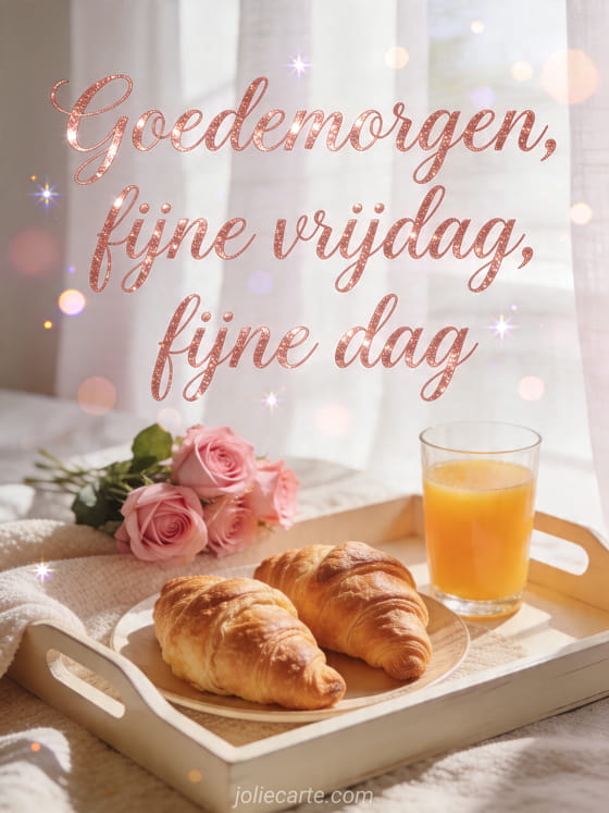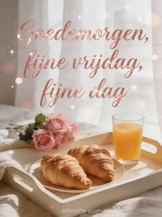 Deel een warm goedemorgen en fijne vrijdag met deze gratis kaart en maak de ochtend mooier met een elegant ontbijtgevoel. Ontdek ook fijne vrijdag kat, goedemorgen het is vrijdag gif of vrijdag kusjes gifs.