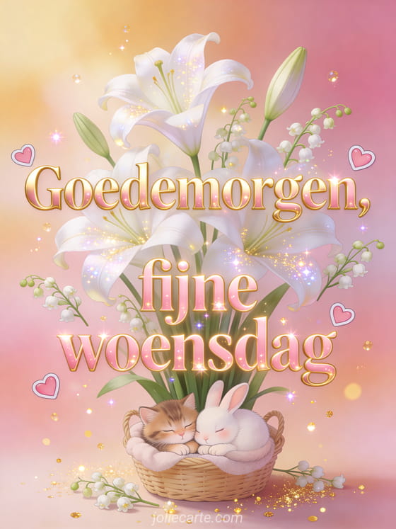 Deel een zachte kaart voor goedemorgen fijne woensdag met roségouden letters, roze harten, lelietje-van-dalen, majestueuze witte lelies en een kitten dat met een konijn in een gezellige mand slaapt. Ontdek ook fijne woensdag bloemen gifs, deze goedemorgen goedemorgen fijne woensdag afbeelding of deze fijne woensdag foto's.