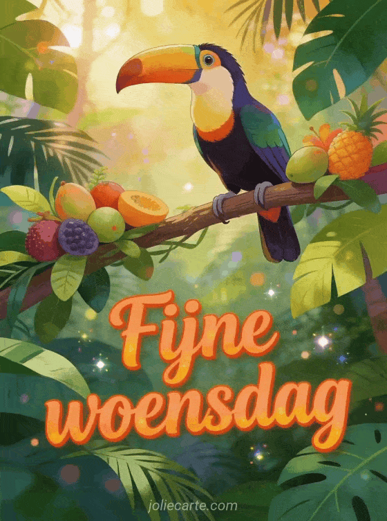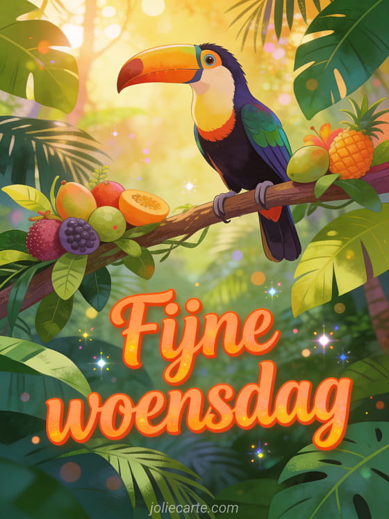 Stuur een kleurrijke fijne woensdag groet met een toekan op een tak naast exotisch fruit in een weelderige jungle, warm goud licht en felle tropische kleuren. Ontdek ook fijne woensdag kusjes kaart, fijne zonnige woensdag afbeeldingen of tekst om een fijne woensdag te wensen.