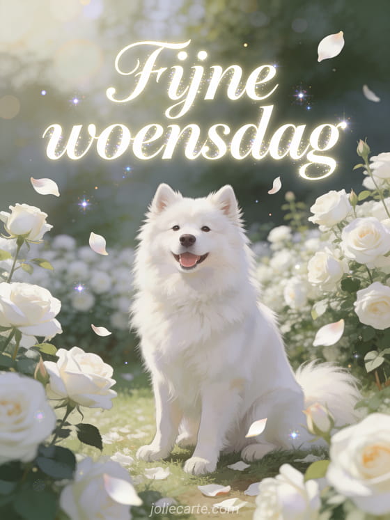 Stuur een elegante woensdaggroet met een pluizige witte samojed in een bloeiende tuin met witte rozen. Ontdek ook geanimeerde hond kus gif fijne woensdag, fijne woensdag tekst of gratis fijne woensdag afbeelding.