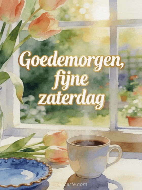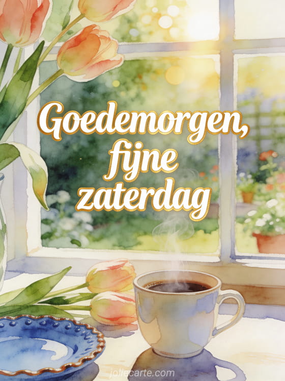 Begin het weekend met een warme goedemorgen en fijne zaterdag in heldere witte letters met een gouden rand. Deze gratis kaart toont een gezellige ontbijthoek, een dampend kopje koffie, verse tulpen en een blauwe schotel bij een zonnige raamtuin. Bekijk ook een fijne zaterdag geanimeerde gif, een heel fijne zaterdag gif of gratis afbeeldingen fijne zaterdag en fijn weekend.