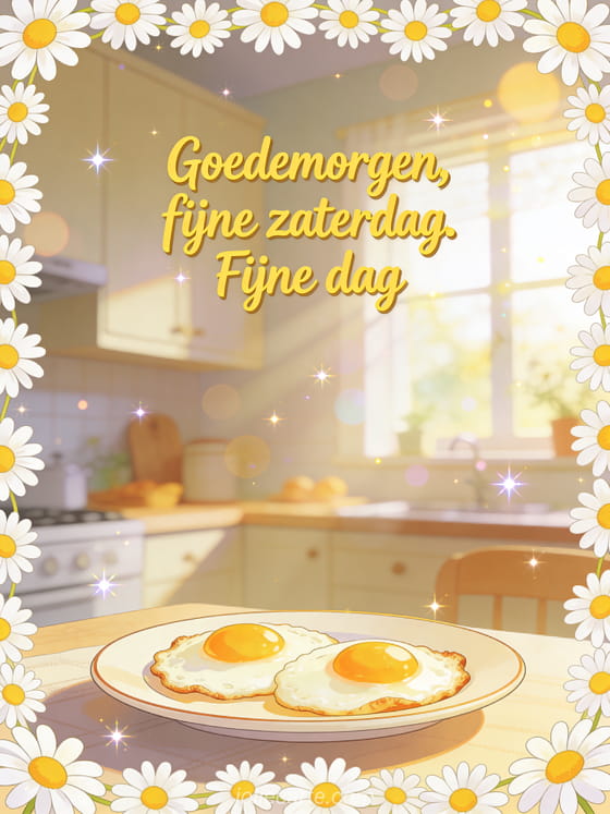 Deel een heldere goedemorgen fijne zaterdag groet met zongele sierletters, een rand van madeliefjes en een gezellige ontbijthoek met spiegeleieren. Ontdek ook een kaart voor fijne zaterdag en fijn weekend met kusjes, een afbeelding voor fijne zaterdag en fijn weekend of een goedemorgen fijne zaterdag kerstkaart.