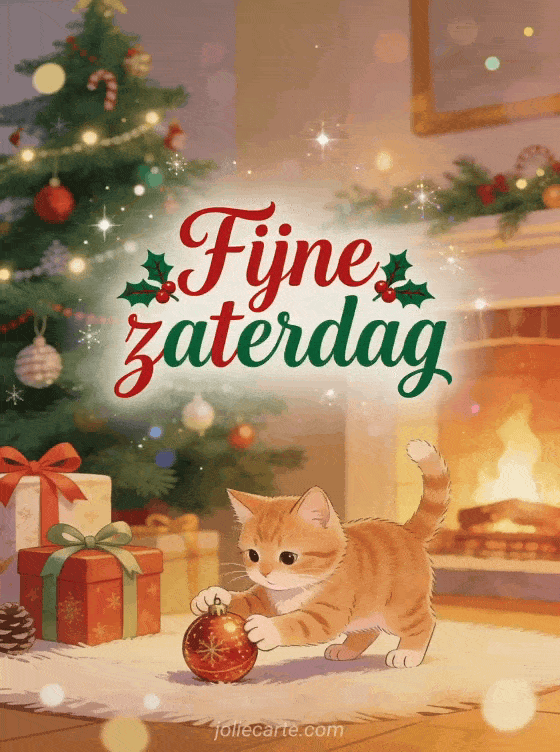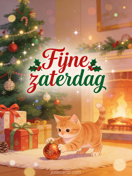 Deel een warme kaart voor fijne zaterdag Kerstmis met rode en groene letters, een versierde boom, een lieve rode kat die met een ornament speelt, ingepakte cadeaus en het warme licht van de open haard. Ontdek ook fijne zaterdag grappige afbeeldingen of fijne zaterdag met katten.