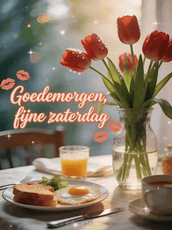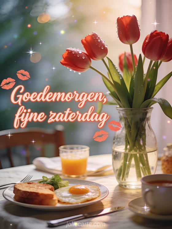 Deel goedemorgen fijne zaterdag kusjes met rode tulpen in een glazen vaas met ochtenddauw, in een romantische ontbijtscène. Stuur meer zaterdagvreugde met landschap fijne zaterdag landschap, grappige fijne zaterdag of fijne zaterdag gifs.